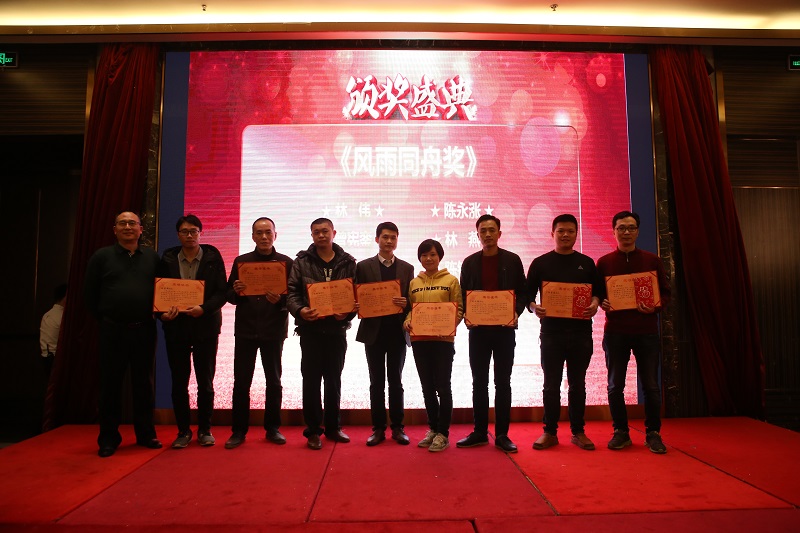 年会伊始,率先进行了“风雨同舟奖”颁奖。在温情的音乐声中,公司总经理林荣强一一向台上8位过去为公司默默奉献十年光阴的员工们颁发奖状及5000元现金红包,并亲切地握手对他们多年坚守岗位所付出的努力与贡献致以最衷心地感谢。